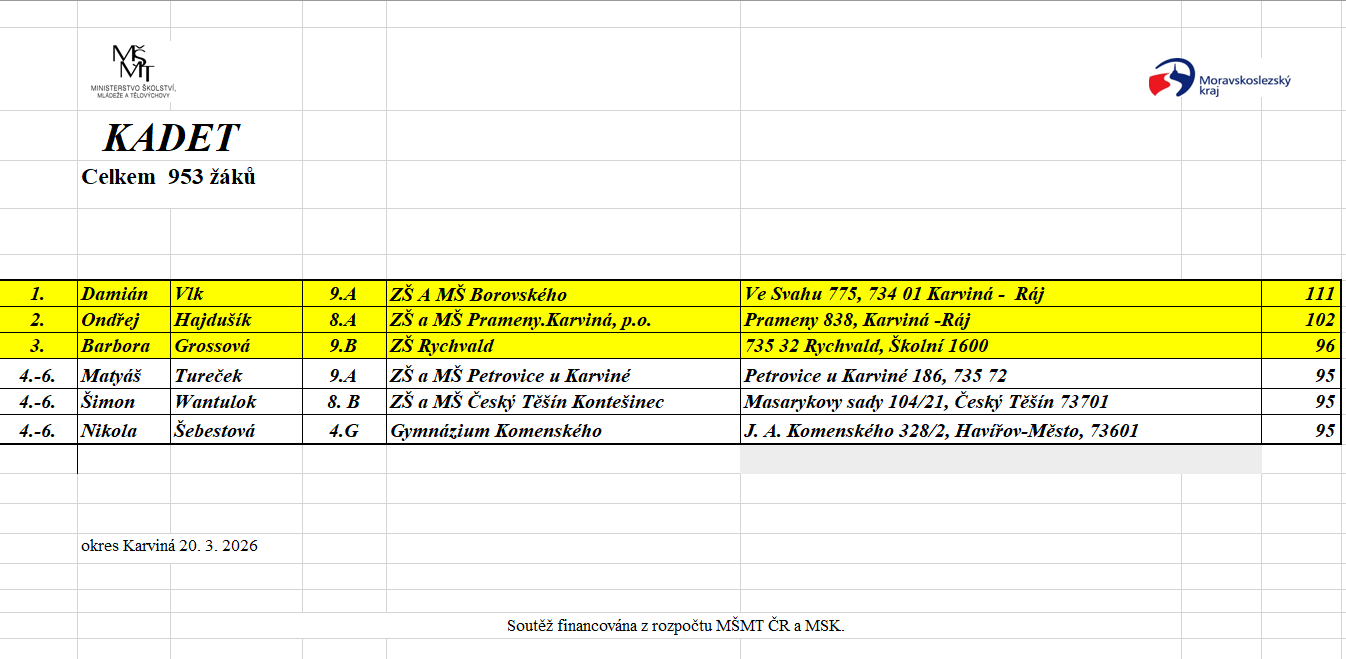 Matyáš Tureček z 9.A se po sečtení bodů žáků v celém okrese Karviná umístil na krásném 4.-6. místě. Gratulujeme!